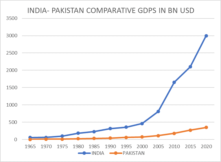 Articles in leading dailies of Pakistan , our proverbial “Other Side of the Hill” make things crystal clear. Pakistan, the recipient of our strategic restraint and surgical strikes, fears both! To put it in context one must have a macro view of the core issue. The economy is the real battlefield. The perspective becomes clearer when one compares the GDPs of India and Pakistan as shown in the graph below (projected up to 2020). The Pakistani view is that “If India continues growing at its 15-year average annual rate of approximately 7.5pc and we stick to our current average growth rate, its economy — and thus its ability to spend on its military — will be more than 20 times our size by 2047”[2]. Game set and match to India!