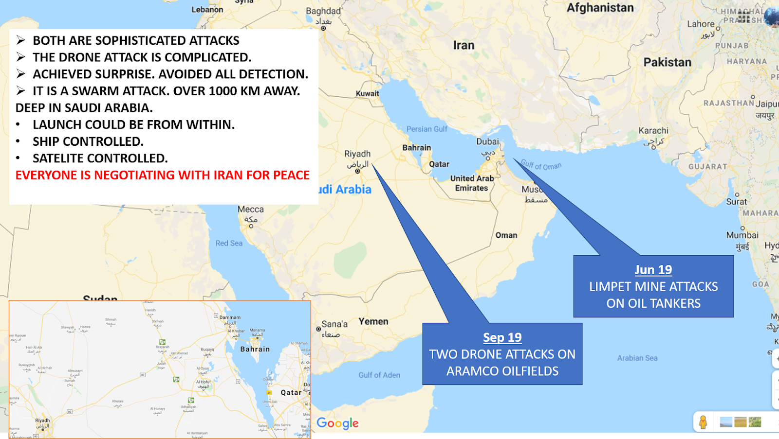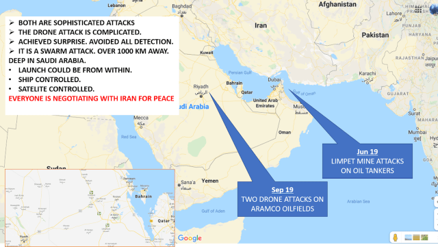 Analyze the multiple unmanned aerial attacks on the Saudi oilfields at Khurais and Abuqaiq. It was a swarm attack more than 1000-1500 km away with weaponized UAVs. They had to be controlled from a Satellite, Aerial Relay or Ground Based Controllers near the targets. Requires a high degree of training and skill set. A very sophisticated attack planned by either Houthis or Iran. Both are not great military powers.