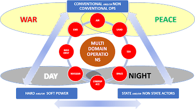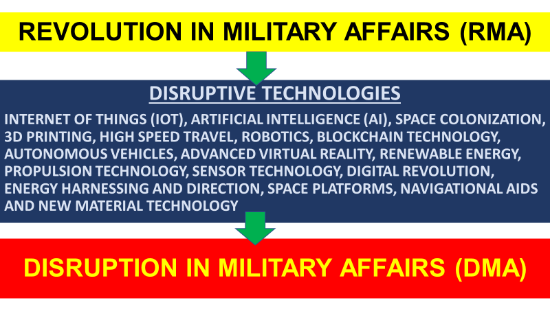 Military Generals have often been accused of fighting tomorrows war with yesteryear experiences which will never occur in the future. Hitherto fore, they could get away with it since warfare was evolutionary. One could relate to the past and project it into the future without missing the woods for the trees. The much-touted Revolution in Military Affairs (RMA) revolutionized the weapon systems through technology but the battlefield remained confined to Land, Sea and air. That was the past. Tomorrows technologies are disrupting both the battlefield and weapon systems. That is why I call it Disruption in Military Affairs (DMA). The emerging multi domain battlefield is far different from the three- dimensional battlefield of the past. Flag officers of the yore were experts in one domain, could understand the other two domains reasonably well and could operate together in what was commonly known as “Joint Operations”. I sincerely think that era is over. Today’s flag officers (hereafter called Generals) must provide leadership in an enlarged battlefield with increasing levels of disruptive technologies.