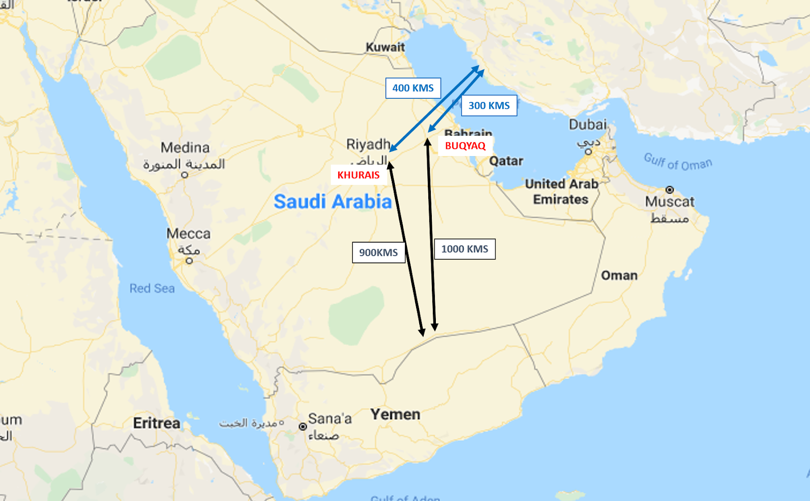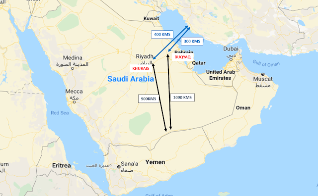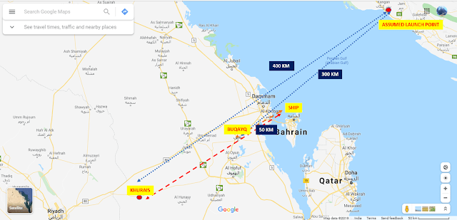 Basic Premises. Since there are no reports of missiles having been fired from UAVs, I am assuming that the UAVs were weaponized with laden explosives. In any case the targets were also combustible and hence weapon lethality and capability were probably minimal, rudimentary, simple and effective. The crow flight distance between an assumed launch site on the Iranian cost and Khurais is about 400 km. Hence the UAVs for this mission would need to have an endurance of 600 km at least to traverse an operational route avoiding air defenses and habitation. This translates to about 6h endurance at an estimated speed of 110-125 kmph.