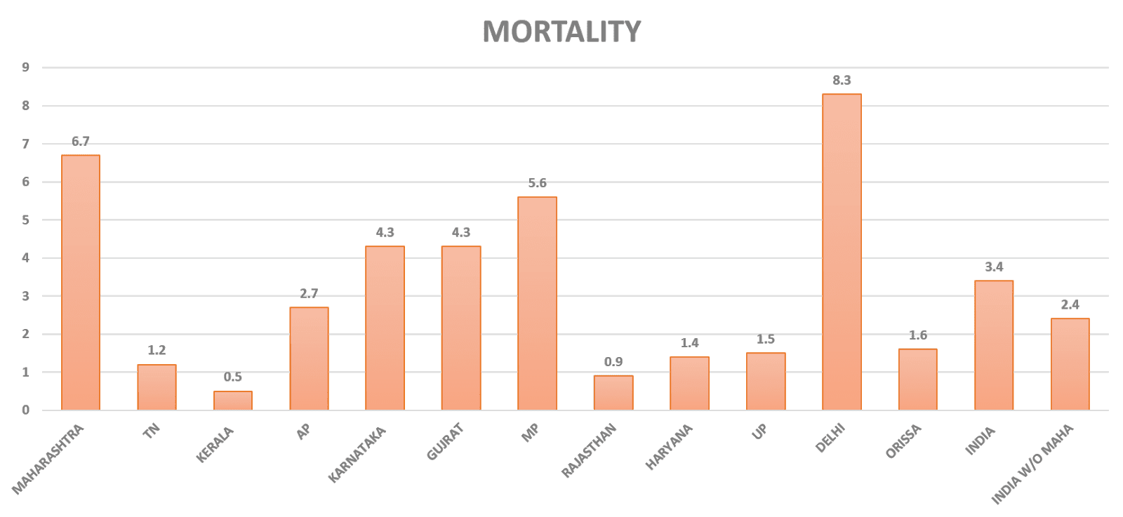 The overall fatality rate continues to be one of the lowest in India. Even in individual states, the rates are low. However when one looks at numbers closely, Maharashtra, Delhi, MP and Gujrat seem to be on the higher side. These states need to introspect.