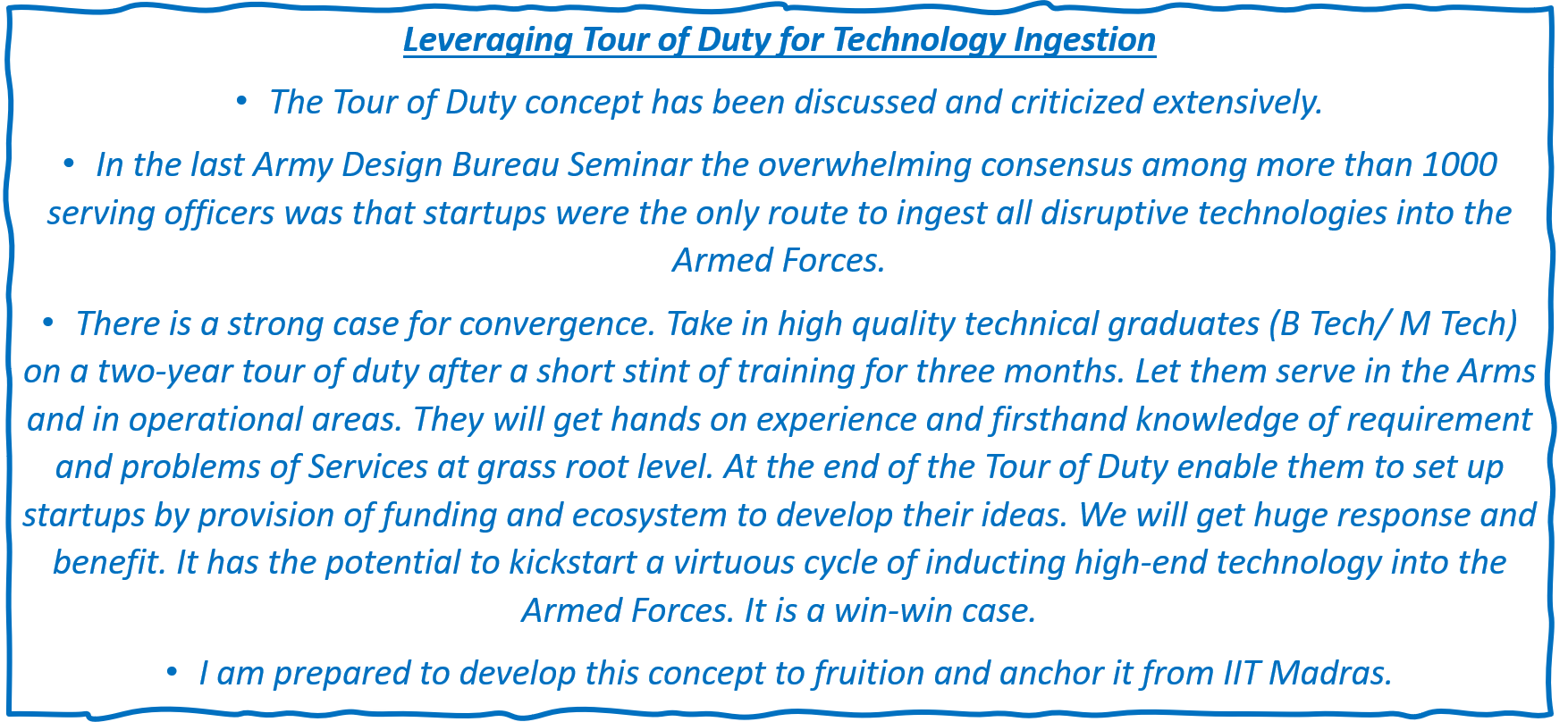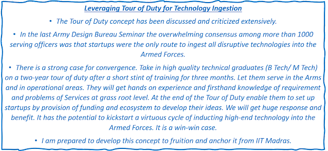 However the Armed Forces need to move out of their citadel and hit the ground running. We need to evolve our model based on our conditions, go beyond DRDO to IITS and other academic institutions of repute and link them with Industry. Most importantly we need to Take control of our destiny and craft a way forward to attain self-sufficiency. Fundamentally it comes down to good leadership. In addition I feel that the tour of duty idea can be leveraged in the startup scenario as highlighted in the box.