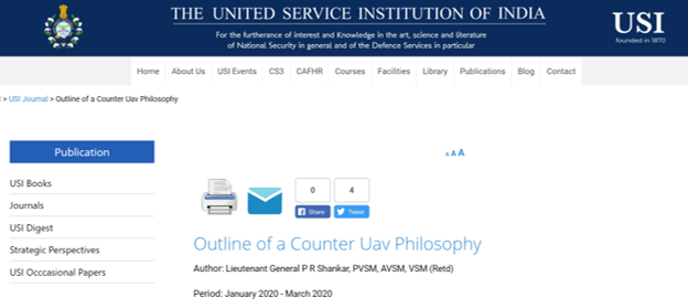 UAV operations are coming of age and the UAV threat is increasing by the hour. As the threat increases, the need to protect own forces and vulnerabilities against this potent game changing threat is also growing. However, counter UAV operations are at a nascent stage and are greenfield in nature. They are just surfacing and lack clarity in how to approach them. In any perspective, counter UAV operations must be a systemic approach and this must mesh in with existing Air Defence systems in the battlefield and with other civil systems which will evolve in future.