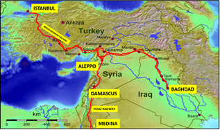 It was built from 1903 to 1940. It was approx 4900 km long, traversing modern-day Turkey, Syria, and Iraq to Basra, in the Persian Gulf. Germans wanted to counter the British Empire by bypassing the Suez Canal to threaten its dominance in colonial trade. Turkish interest was twofold. Firstly, countering its Russian rivals. Secondly control of Arabian Peninsula and expansion across the Red Sea into Egypt, then under British control. Expansion into Egypt was through an offshoot called the Hejaz railway (Aleppo to Damascus to Medina). The Hejaz Railway was targeted through guerrilla warfare by Lawrence of Arabia. He never let it function fully.
