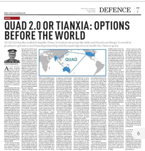 QUAD2.0 has the toolkit to handle China. It needs to sit across the table and thrash out things. It is now widely accepted that an alliance is not feasible. It would be more prudent to get into a need-based partnership with focused objectives to bottle the Chinese genie. Alliances can be thought of later. “It’s time for free nations to act” as per US Secretary of State. The free nations must also decide whether to slide into the hell of a Chinese ‘Tianxia’or bring the QUAD2.0 on.