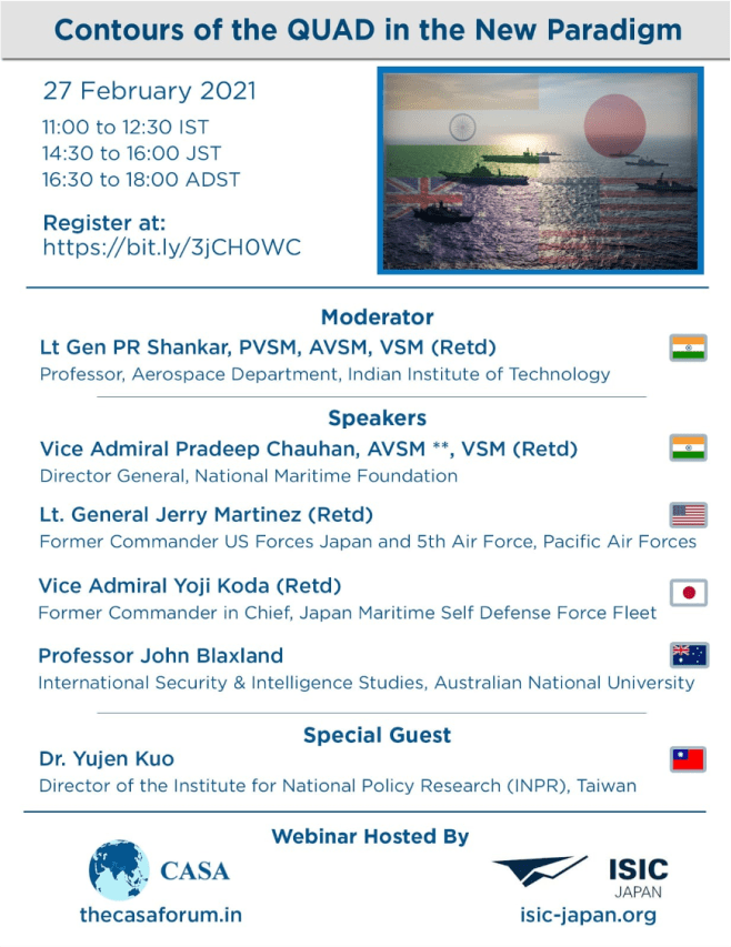 In order to pave way for all these issues an International Webinar is being organised on ‘Contours of the QUAD in the New Paradigm‘, on 27 Feb. the event is being organised by CASA (INDIA) and ISIC (Japan). The details of the event are as indicated below.