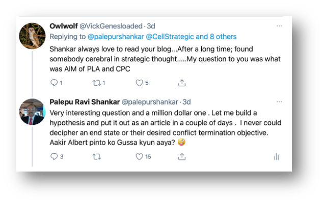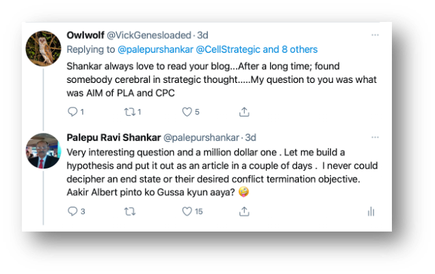 A question was posed on Twitter . What was the aim of PLA and CPC?  Why would China, the wannabe superpower use military force against a rising nuclear India, without a clear cut aim? Further, China goes back to its starting point, ostensibly, without achieving its aim. As per our understanding.  Hence the issue compounds.  Understanding this is very important to enable us deal with China better. This is a regressive hypothesis based on hindsight. It might not be exactly correct.  So be it.