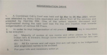 The Prime Minister while addressing the valedictory session of the Combined Commanders Conference stressed the importance of enhancing indigenisation in the national security system, not just in sourcing equipment and weapons but also in the doctrines, procedures and customs practiced in the Armed Forces… He also called for a holistic approach, focused on breaking down civil-military silos… He advised the Services to rid themselves of legacy systems and practices that have outlived their utility and relevance…For the first time in many years the political executive was interacting with the Armed forces and directing them to do something instead of mouthing inane homilies. Heartening. While the overall slant of the address was great and positive, the larger message on requirement of indigenous doctrines, procedures and customs in the armed forces and focus on breaking down civil-military silos need examination. We should not embark on a senseless indigenisation programme or come out with routine instructions like the one below.