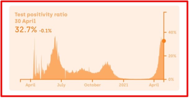 Who is leading Delhi out of this crisis? The PM? The HM? The CM? The SC? The HC? The LG? Delhi, our national capital seems to be a rudderless boat adrift in a storm. Leaderless would be more apt. As it is Delhi is polluted and asthmatic. This is now compounded by the pulmonary character of the Chinese virus. The published test positivity rate is over 32% but actually could be as high as 50% ( graph below). Every alternate tested person could be positive. People are losing lives which was avoidable. Stories coming out of Delhi are horrendous. There is rampant black marketing of anything to do with Corona – oxygen, testing, Remdesivir, hospital bed, ambulances, funerals…The problem seems to be only worsening with a vial of Remdesivir now costing anything between Rs 30000- 40000 in black. This now beyond the issue of India’s Image etc…All this black marketing and racketeering is happening under the nose of the national leadership! What a shame!