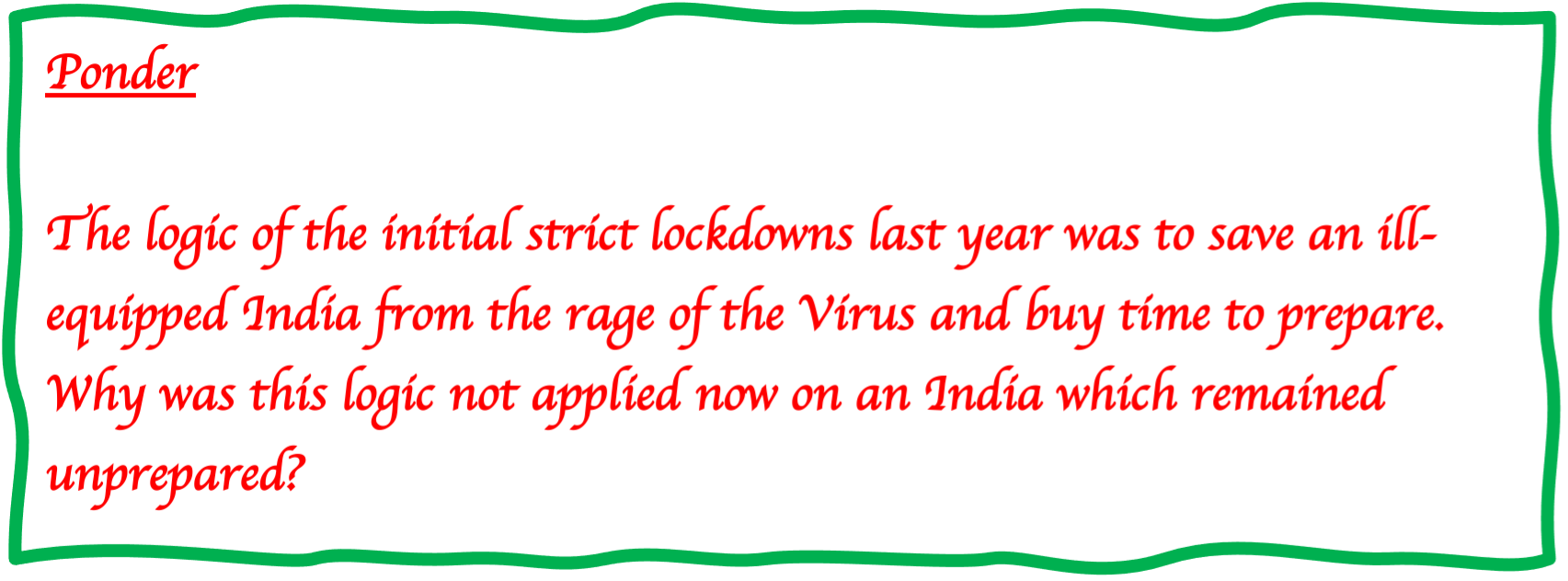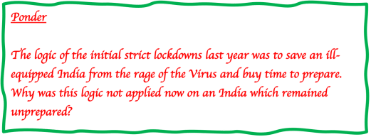Delhi is my capital. It is the place where all of us Indians look up to. The whole world looks at it. Delhi cannot go down. It is indeed so demoralising that the central and state leadership have abdicated their responsibilities and are only busy blaming each other. The stories in the social and unsocial media are not polished / burnished / manufactured any more. They are not political in nature. The stories are about death, despair, helplessness, and a tragic situation never witnessed before. They are real life situations of people whom we have known for a long time. They are last time talks of dying people. They are leaving dark voids in many of our memories and these voids are being filled by aversion of the current ruling and opposition class. The growth of the black market indicates the increasingly colossal failure. The invisibility of the government is astounding when four hundred people are dying a day. When New York was in crisis last year, the Governor was briefing the public and media daily. When Mumbai and Maharastra are in a spin, their CM and key officials are visible in public. They are tackling issues head on despite the grave condition. People are with them. It is palpable to me sitting in Chennai. Talking of Chennai, Remdesivir is being made available through a makeshift PDS at government cost. One has to stand in a queue for 3-5 hours. So be it. It is at least available. I can vouch for it since the queues at Kilpauk Medical College where Remdesivir is being sold extend to near my house (since the past five days)! The price is ₹1,565 (including GST) per dose. Why can’t such fundamental things be done in Delhi? Why do hospitals have to go to courts even now? Why should the central and state government not ensure that adequate oxygen is available? Why has testing not been ramped up? Why have RWAs and flats not been told to convert their clubhouses into Covid holding facilities with doctors resident in the societies looking after the residents there? This has been done in many places. Why are RWAs not been co-opted in the struggle? They can generate organisation and quell panic. When a retired brigadier in Delhi asks the question on 02 May 21– who is the minister of health? – it reflects the utter state of irrelevance of the individual.