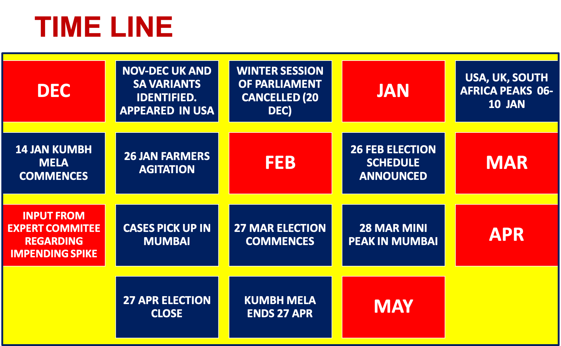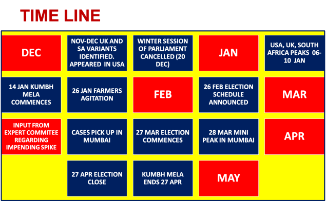 The fact that the government chose to ignore the problem is now more than apparent. The Timeline graphic above is ample proof of that. In Nov-Dec the virulent UK and South African variants made their appearance. By the first week of Jan, USA , UK and SA were having their peaks (see graphs below). With the kind of people connect we have with these countries, it was only a matter of time that these variants would land at our doorstep. It was fundamental sense Mr Watson. Where were the Sherlock Holmes’ of all the empowered committees? These high powered failures must have had all this data with them. In fact, the winter session of the Parliament was closed due to the then prevalent Covid situation. However, it is strange that our lawmakers went ahead with the Kumbh Mela and Elections in the form they were held. Our less than moralistic but opportunist opposition sided with the farmers with their agitation to conflagrate the virus situation. All the parliamentarians wanted to save their own skins but put to risk the lives of millions. Great leaders! Why were not these super spreader events made virtual? An expert committee outside the empowered committees of the Government flagged the risk of the second wave as per reports and it was ignored. By the third week of March, cases started spiking in Mumbai (see graph below). Reports surfaced of a virulent variant from the Vidharba region. Did anyone investigate them? It was only logical that the situation will spread to other metros and definitely Delhi. Yet it is now beyond doubt that we threw caution to winds and did exactly the opposite. I am not an expert. However, even an imbecile, if given this Timeline, would have unhesitatingly pointed a finger in the right direction. Our leaders and the Government have lived in a bubble of surreal thinking and the political greed of victory in polls. It is a pyrrhic victory for all those who have won in the polls. Even when cases started to go up in Delhi , we did not react. The Tu Tu Main Main between the kabbadi teams of the Central Government, State Government, Political Parties and Judiciary is playing havoc with the people who are running from pillar to post. This havoc has now descended into utter chaos. The fact that deaths due to lack of Oxygen are still happening in leading hospitals, six days after the alarm bells have sounded reinforce this fact. I have never seen such a sad state of our capital.