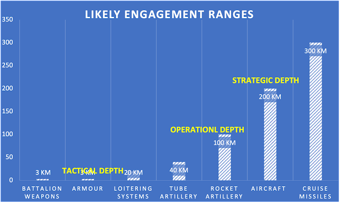 In the Indian context, battle is most likely in the Himalayan terrain. This restricts the domains through which conflicts will take place even in a multidomain contestation. Also, war as it is understood between nuclear countries is increasingly unlikely. The greater likelihood is extensive military posturing. Limited military conflict within acceptable thresholds of violence can occur. As per past empirical models, the Kargil conflict with Pakistan at one end and the Sino Indian face offs in Eastern Ladakh at the other end represent the likely conflict spectrum. Escalation control beyond this acceptable threshold is risky and dangerous. It is unlikely that this spectrum is breached. However, we need to be prepared for all possibilities. In most eventualities, in tactical, operational and strategic depths, firepower will be used for posturing and muscle flexing constantly. The likely engagement ranges (in Kilometres) of the firepower spectrum are tabulated. These are not the maximum range capabilities of weapon systems but the maximum ranges at which engagements are most likely to take place. Keeping escalation dynamics in view, the chances of using ground-based firepower is far greater than aerial firepower. In a maritime scenario, surface and subsurface firepower will also come into play. However, once fighting actually breaks out, firepower is more likely to be applied at the tactical and operational depths. It is unlikely to be applied at strategic depths. In all cases firepower represented by the Regiment of Artillery will dominate the battlefield in peace and war. In this context it is noteworthy that long range tube and rocket artillery spans the entire battlefield spectrum. It will be complementary to airpower at one end and be directly involved in the contact battle at the other. Long range artillery is a suitable complement for airpower. It compensates for lack of fighter sqns of the Indian Air Force (IAF), which will last for the foreseeable future. It frees up all the available airpower for air superiority tasks. Keeping the aforesaid in view, an examination of various facets of long-range firepower of the Regiment of Artillery are presented in this chapter.