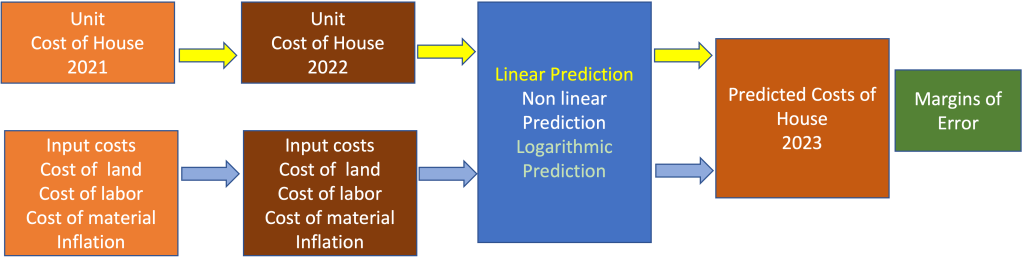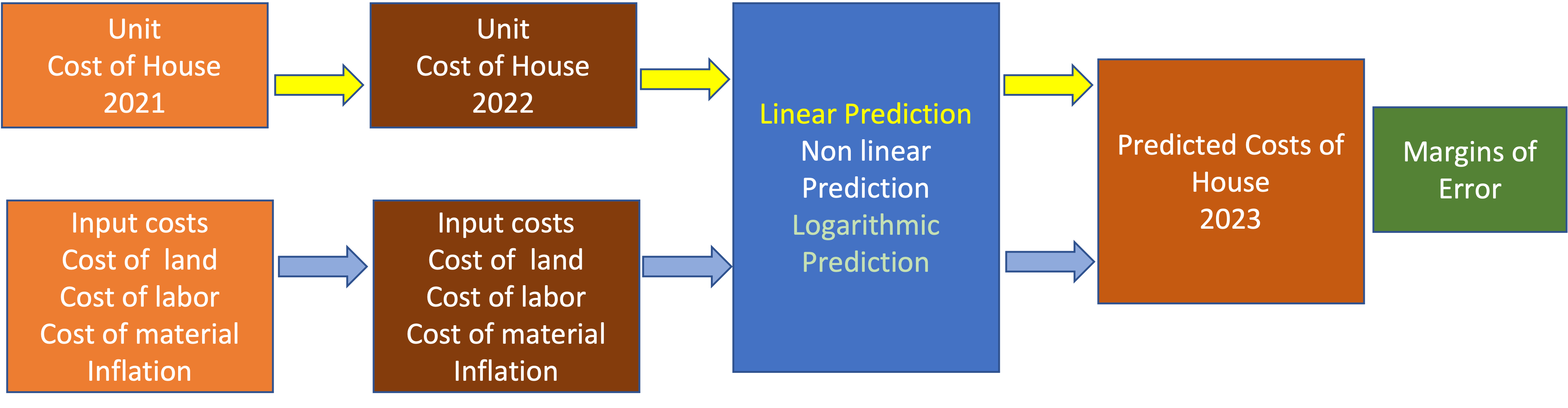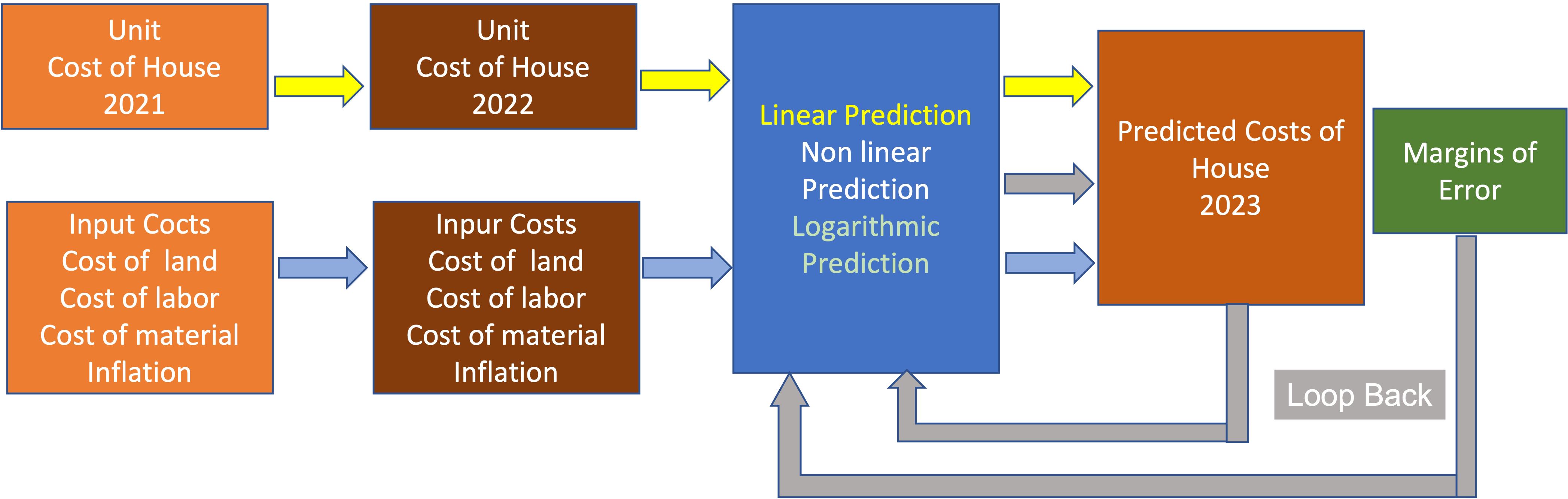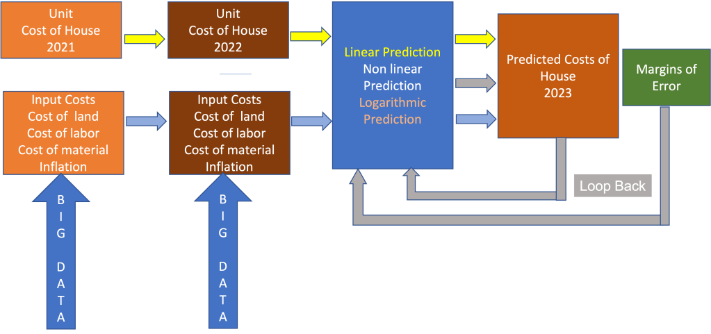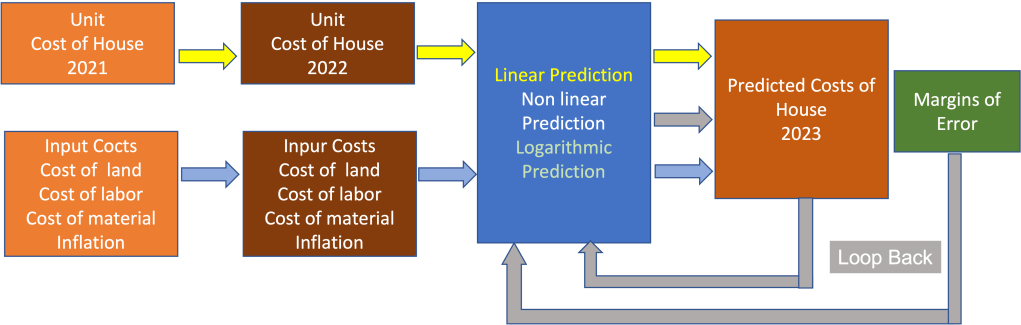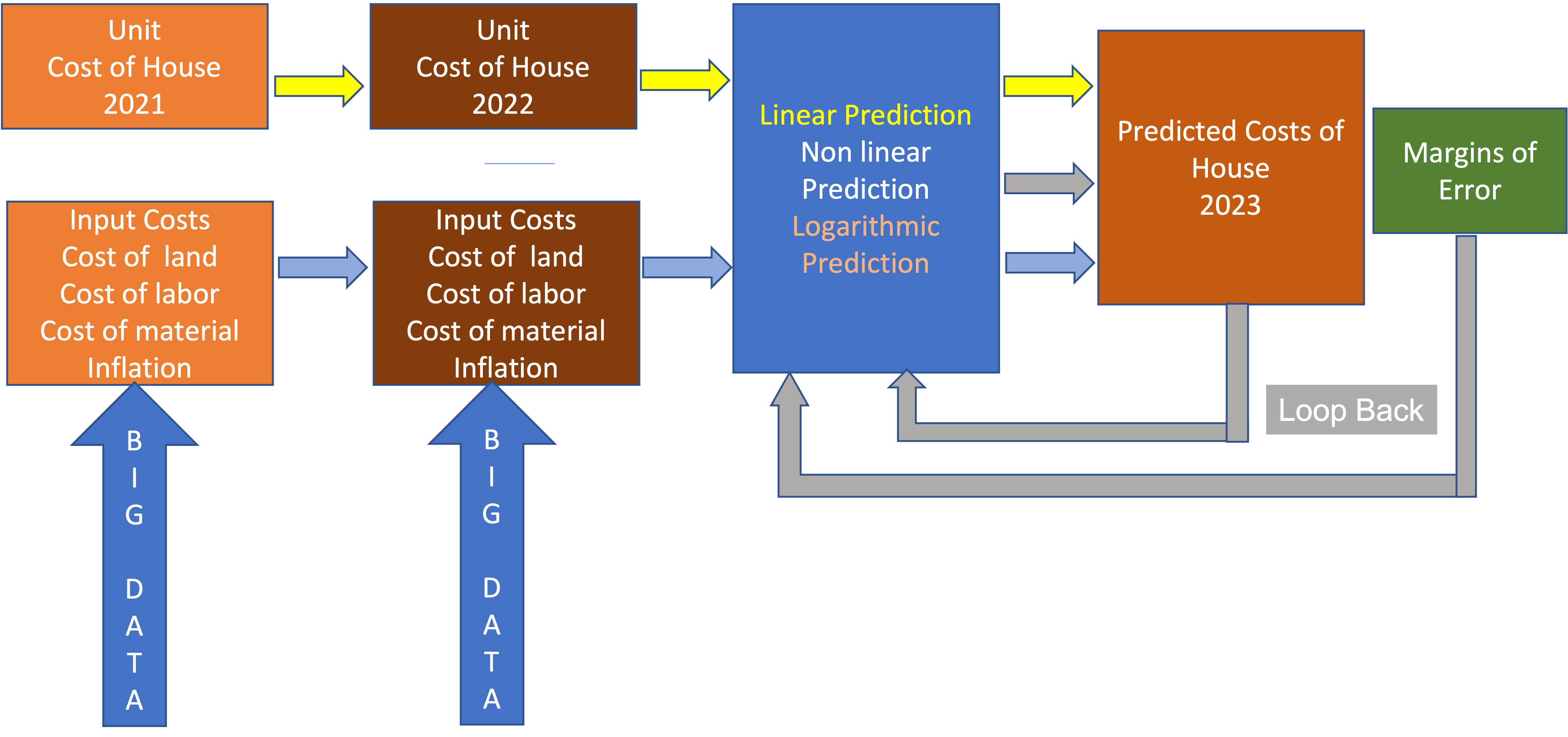 The cost of a house could be either the unit cost when bought as a whole or the sum of input costs which go into making the house. For this example, consider that these input costs are limited to land, labour, material and inflation only. In Stage 1, these costs for 2021 and 2022 could be fed individually or in an integrated form to a AI platform/machine and run though programs based on mathematical algorithms. These could be linear, non-linear or logarithmic predictive models. The output would be the predicted costs of a house in 2023 within a upper and lower limit in a band. The output would also contain a margin of error.