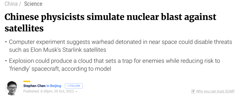 The article in the SCMP indicates that Chinese scientists are experimenting to detonate a 10 MT atomic warhead near the edge of space. Technically this area is widely known as the near space. The Chinese intent is to create a temporary cloud of radiation that could quickly damage or destroy a large number of Low Earth Orbit Satellites. There are many questions about this anti-satellite (ASAT) thought process even if it is practical. With increasing militarisation of space, such ideas, proposals and debates are dangerous. Such maverick actions have serious ramifications beyond the normal and we need to understand them in detail to tackle them. The proposal is ostensibly to destroy satellites which are considered as threats to the PRC. This article talks of destroying Elon Musk’s Starlink constellations but such action could be easily applied against Indian and all other satellites too. In my opinion, even Chinese satellites are not exempt from being affected.