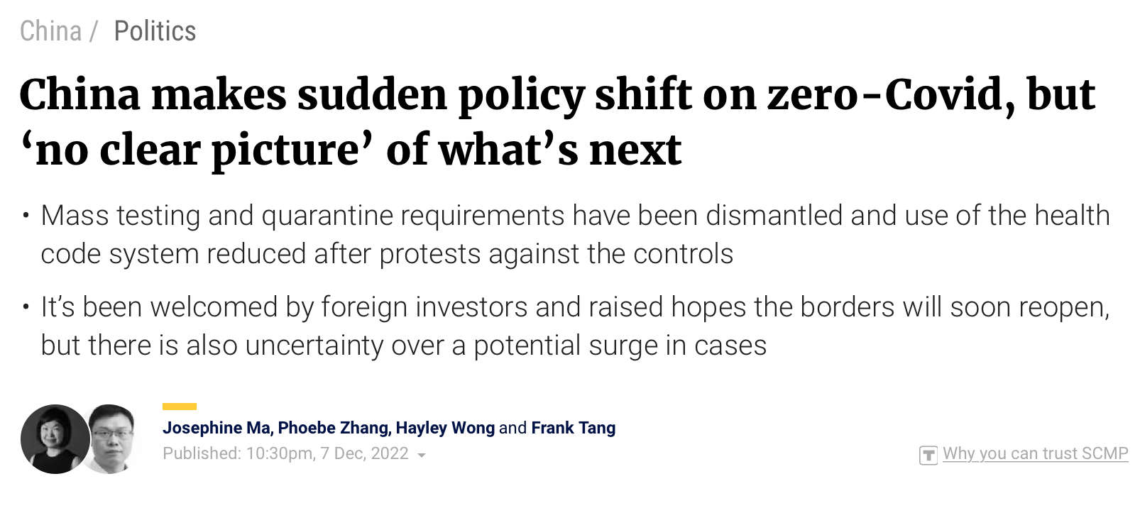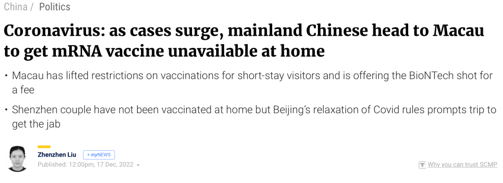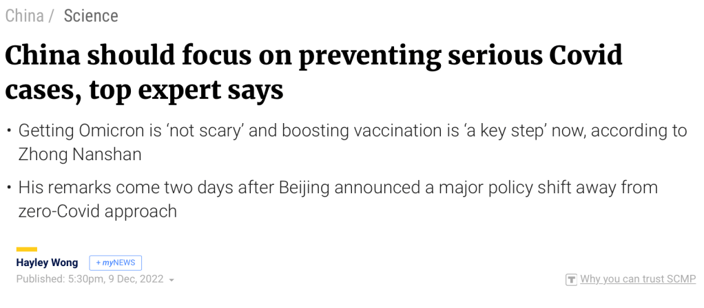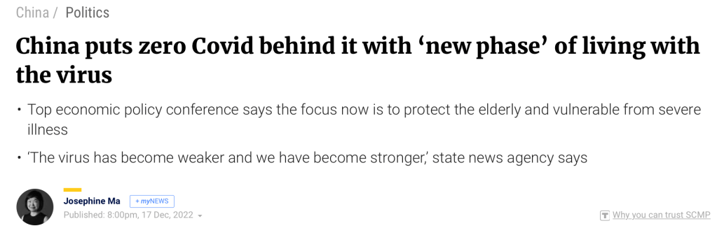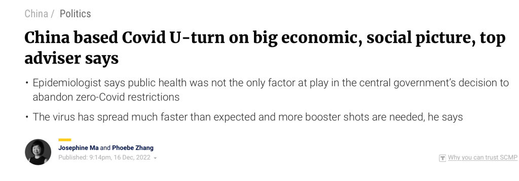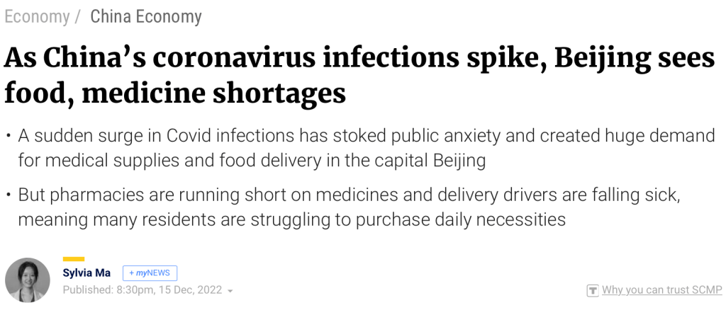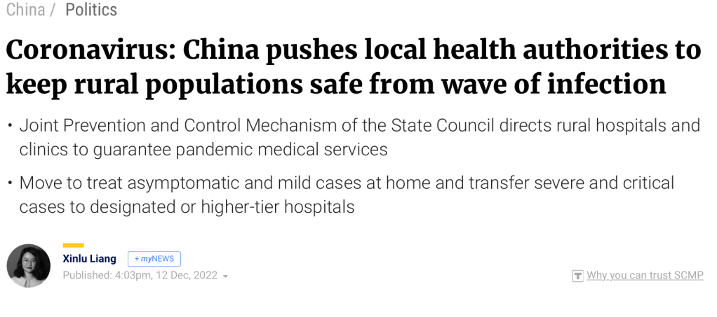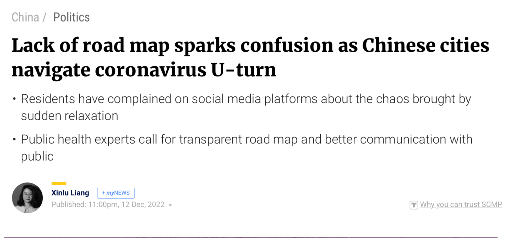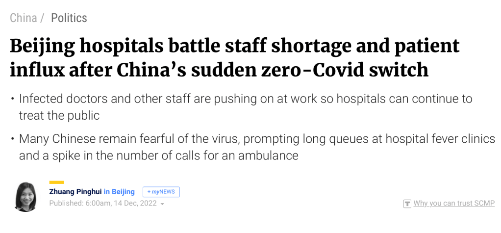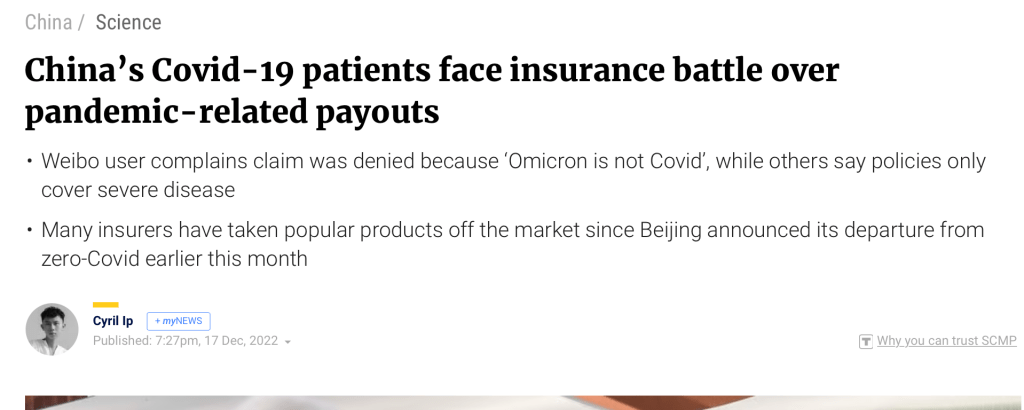 Please go through the headlines of all these articles which have been published by the South China Morning Post in just the past one week…in fact it appears that China under Xi Jinping is like a headless chicken in amaze…no vaccines…no medicines..scared of infections…no insurance…no clear picture of what to do next…hospital shortage….staff shortage…confusion confounded!