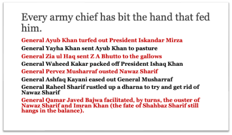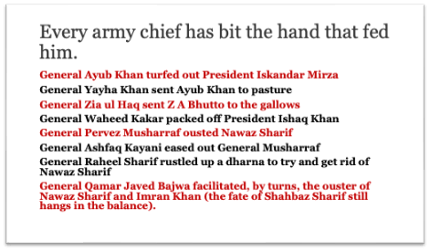 All this is very confusing indeed. So let us look at the Naya Generals who have taken guard at the crease. They are regular openers and will carry their bat through the innings. Irrespective who bowls they always score centuries. They cannot get out. Why? They are also the first umpire, second umpire, third umpire and match referees in Pakistan. Every time Pakistan chooses a Naya COAS democratically, it expects stability and hopes for democracy to flourish. The COAS soon takes over the nation. That is their history as per Najam Sethi (see graphic). Why will it be different this time around?