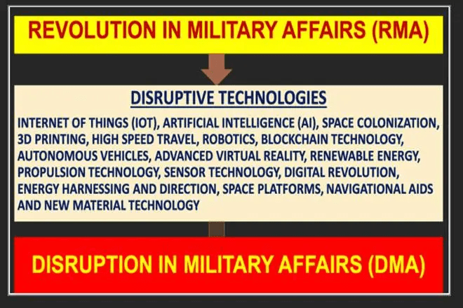 The last decades of the 20th century saw the onset of a Revolution in Military Affairs (RMA). It was the synergistic outcome of technological developments and doctrinal innovation, suitably adapted to battlefield environments. The RMA was most visible during the Gulf Wars. It was based on information, communication and electronic technologies which had burst on to the scene then. They contributed to better navigation, command, control, sensing, and precision on the battle field. However, since the beginning of this century, technologies have started emerging which are commonly known and termed as disruptors. We know them as the Internet of Things (IOT), cybertechnology, AI, space colonization, 3D printing, high speed travel, robotics, block chain , autonomous vehicles, advanced virtual reality, renewable energy and so on. These technologies are now being super fused with traditional technologies which have an enduring relevance and impact on the battlefield. These include propulsion technology, sensor technology, digital revolution, directed energy, space platforms, navigational aids and new material technology to name a few. The fusion of these technologies is a disruptive revolution which is going to shape future militaries and the way wars will be fought in an era of Disruption in Military Affairs as depicted in the graphic below.