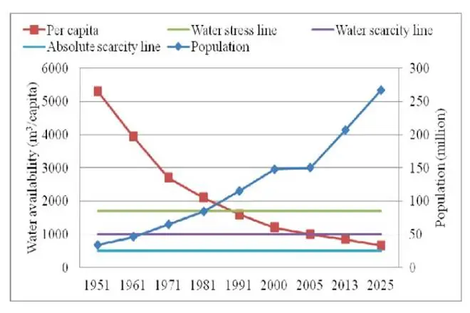 Pakistan is not failing due to its poor economy, terrorism or over-militarism. All other factors aside, it is failing on a permanent basis due to lack of water. Pakistan’s water availability graph (above) , indicates that as its population exploded, it became a water-stressed nation in the 90’s. Around 2005, it entered the water-scarcity zone. Beyond 2025, it is heading into the absolute water scarcity zone. When Pakistan goes below the absolute water scarcity zone shortly, it will enter the arena of perpetual failure. Pakistan’s two major water reservoirs, Tarbela and Mangla, are silted up. Both dams dip to dead water levels in summer. The under construction Diamer Bhasha Dam caters only partially, for loss of water capacity due to silting of existing dams. There are no additional sources of water other than a dying Indus nor has Pakistan’s water storage capacity increased. The IMF bailout(s), now or before, are not for ameliorating its dismal water situation. The current bailout does not even meet its short term requirement to tide over the recent crisis due to unprecedented floods. Every penny spent on Pakistan’s relentless increase in military expenditure has been a penny less for water. All water-related projects have either been pulled out from the China-Pakistan Economic Corridor (CPEC) or are under review with no time line whatsoever. Pakistan’s slide into water scarcity is unchecked. For a country in which agriculture is 20% of the GDP, this is scary. Pakistan was once a net food exporter. It is now a net food importer in perpetuity. There is no solution for its looming food insecurity in sight. Climate change and global warming will further affect water availability and food security adversely. Population growth in future, and any intended economic growth will only increase the requirement of water; which is not available in the first place. In a couple of years when absolute water scarcity takes grip, the situation will spiral down even further. The existing low levels of productivity can only dip further. Pakistan faces an existential crisis. Not from India but from water, rather the lack of it!
