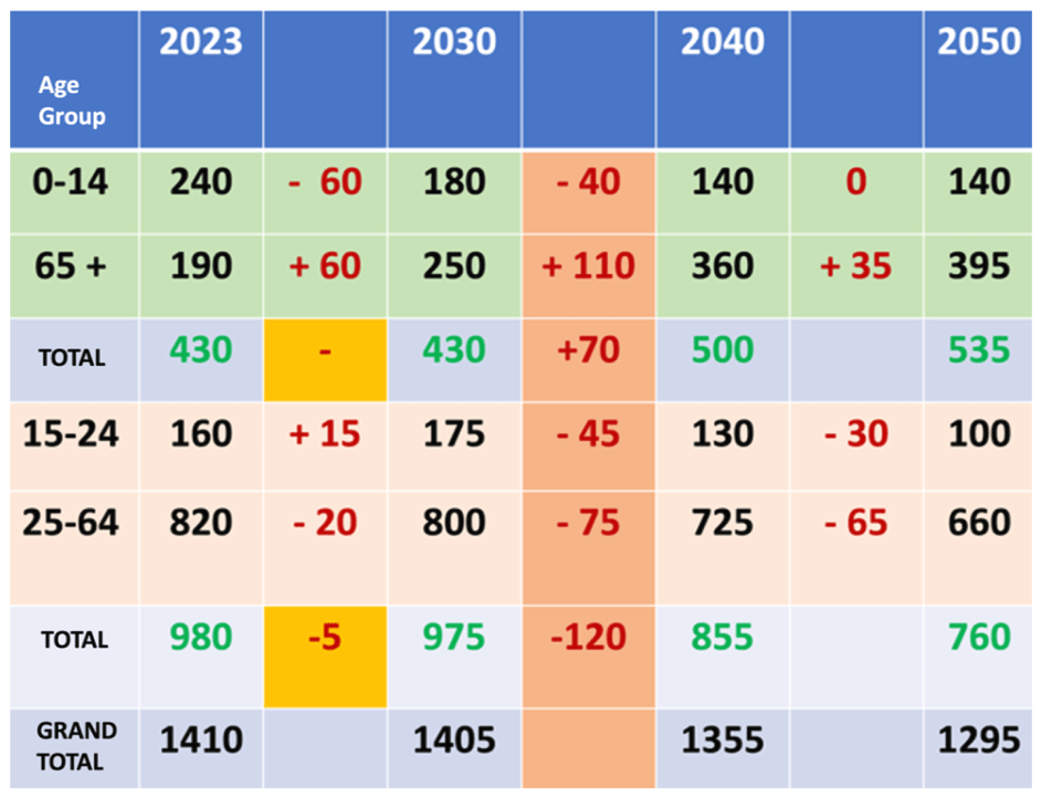The UN graph on Population by Broad Age Groups, duly converted into a table of figures is as given below. In this table the age group 0-14 and 65 + are non-working (dependent) population and have been clubbed together. The working age population – 15-24 and 25-64 has been clubbed together. The population by age group has been tabulated for 2023, 2030, 2040 and 2050. The change in the population groups between these time periods has also been highlighted.