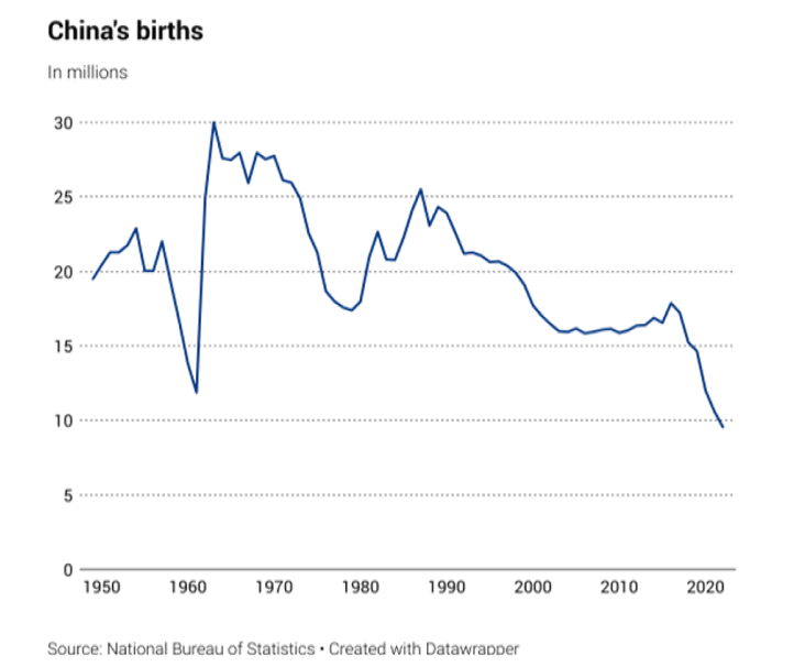 The One Child Policy has consigned China to an irrecoverable demographic decline. The Chinese population is dwindling with abysmal birth rates (1.06) which is far below the replacement rate of 2.1. In 2022, Chinese women had 9.56 million babies (see graph above). This is the lowest total in recent Chinese history. This was also the first time the figure dipped below 10 million as can be seen from the graph above. Incidentally this graph looks like a team which has had a ‘slog over’ collapse. As per many reports the problem will only get worse. In 2023, births could further plunge to between 7- 8 million. That will be catastrophic for China. This sudden drop is a combination of many factors besides the infamous ‘One Child Policy’. It includes female foeticide during pregnancy, gender discrimination, reluctance to marry due to education and employment opportunities, late marriages, increasing cost of raising children , high divorce rates, high living expenses and more. Overall there has been a perceptible change in the Chinese public’s attitudes on getting married and starting families. China’s 2/3 child policies have not borne results despite many incentives including cash rewards. This is evident from the steep fall in birth rates. Even if by some miracle of Xi Jinping and the CCP, China’s fertility rate rebounds to 2.1 and women start having two to three children, the situation will not improve. As per Chinese experts China’s population will still continue dropping until the end of the century, due to a shrinking number of women of childbearing age as well as a rapidly ageing population. The clock of population decline cannot be turned back.