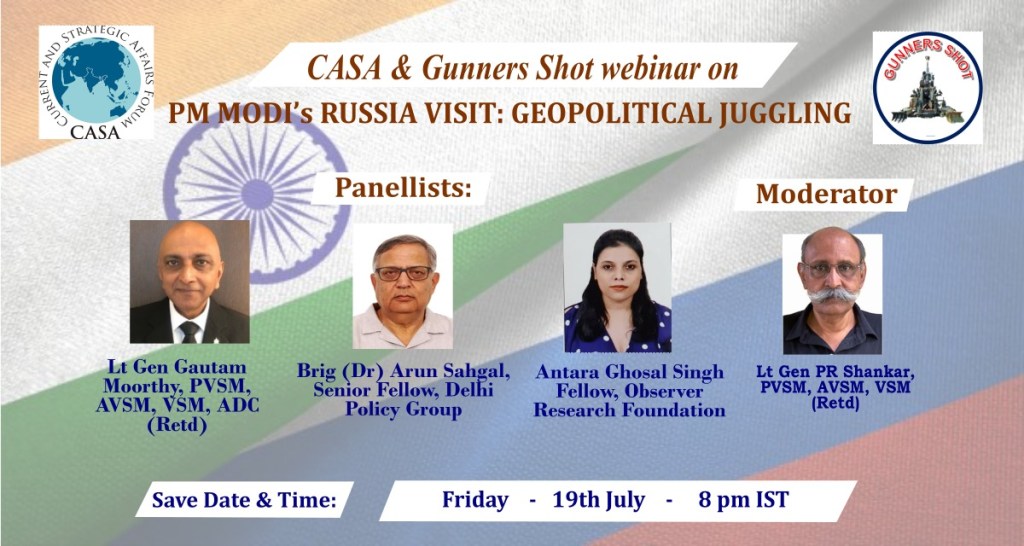 This CASA webinar cast light on the multiple geopolitical angles which have come to the fore during the PMs visit to Russia. These angles pertain to India-USA, India-China and India- Russia relations. More importantly, India’s role as a global balancing power has come to light. In fact in my opinion this visit has opened up the global balance of power equations. With the way things are changing around the globe, a lot of opportunites are opening up for India as much as new threats are looming. We are in for critical but interesting times in the future. The video and flow go disturbed to some extent by the Microsoft outage. However lot of new and hitherto-fore unknown angles have been thrown up in this webinar.